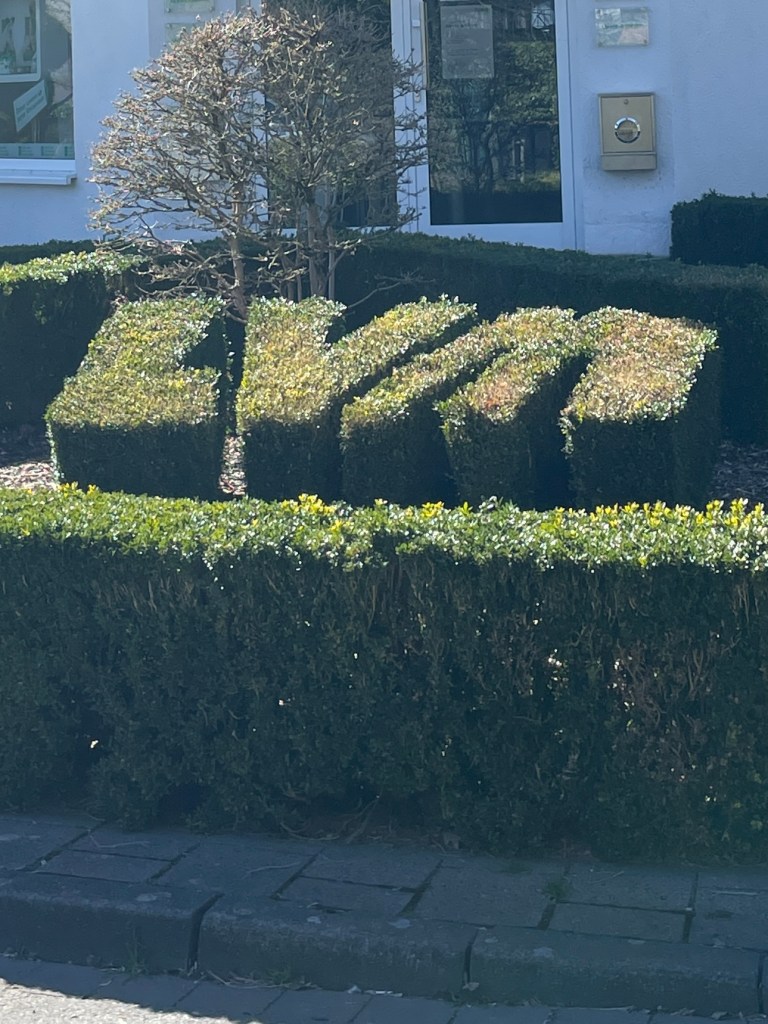 Bild: Die mustergültige Geschäftsstelle ist derzeit verwaist, die Hecke könnte etwas Wasser vertragen. Foto: Frank Biermann